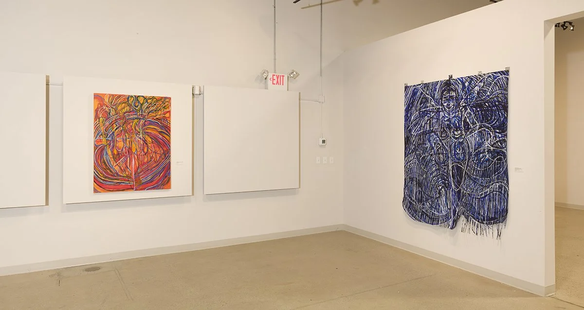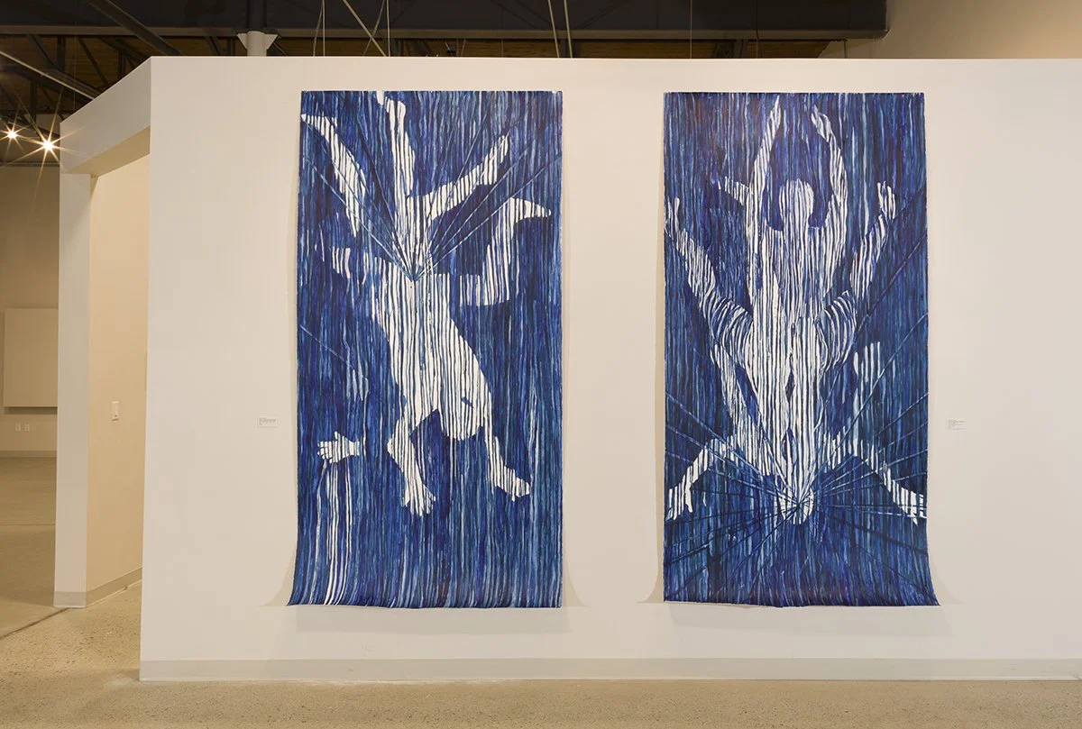 Kelly McConnell, Left: Form Is Emptiness/ Emptiness Is Form, Right: Icara, O Icara! Icara Ridens Cecidit. (Icara Laughed As She Fell.), Arches Paper, Gesso, Acrylic Media, Chalk (2024), both 8'5"x4'31/4"